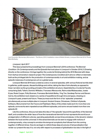 This issue presents the proceedings from Liverpool Biennial’s 2016 conference The Biennial Condition: On Contemporaneity and the Episodic that took place in Liverpool in October 2016.[1] Drawing directly on the conference, it brings together the curatorial thinking behind the 2016 Biennial with ideas from Aarhus University’s research project The Contemporary Condition.[2] It aims to reflect on biennials both as the privileged site for the production of contemporaneity in art and exhibition making, and as episodic instances of contemporary art on a global scale.